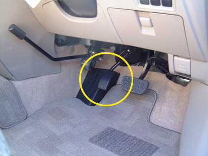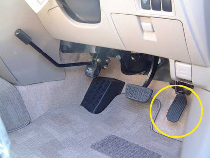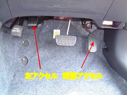 左アクセル装置とは、左足だけでアクセルとブレーキ操作ができる装置です。 右下肢が不自由な方が左下肢で運転することができる運転補助装置です。 ハンドル旋回グリップ・左ウインカーレバーを組み合わせることで左半身での運転が可能です。