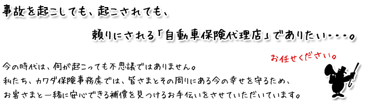 まさかの事故!私たちは、あなたをとりまく様々なリスクを軽減します。 自動車保険に入っているけど、「自分は事故にあわない」そんなふうに思っていませんか。事故にあっていないあなたは、運がいいだけなのかもしれません。