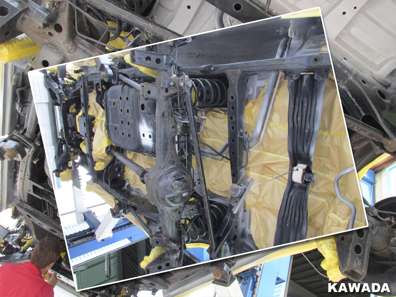 下回りの防錆塗装サービスでは、長期防錆を目的とした半透明もしくは黒色の防錆塗料を塗装します。錆の状態によっては、ホワイトやグレーのチッピングコートを塗布したりします。